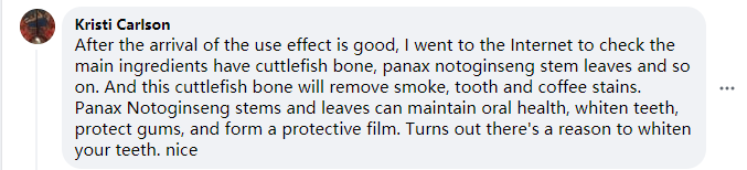 2、After the arrival of the use effect is good, I went to the Internet to check the main ingredients have cuttlefish bone, panax notoginseng stem leaves and so on. And this cuttlefish bone will remove smoke, tooth and coffee stains. Panax Notoginseng stems and leaves can maintain oral health, whiten teeth, protect gums, and form a protective film.