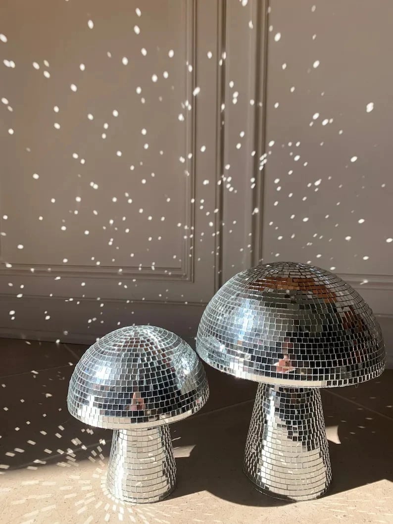 ✨These mushier are formed out of styrofoam, and finished with mirrored glass tiles, individually adhered to perfectly mimic a 'wild’ disco mushroom ball!